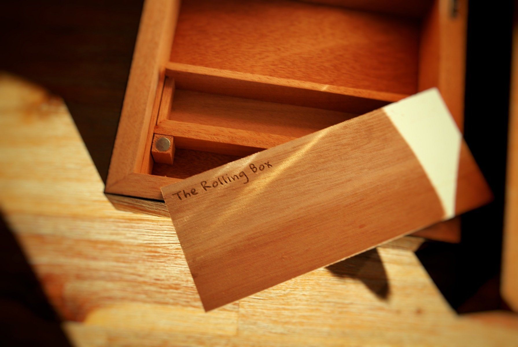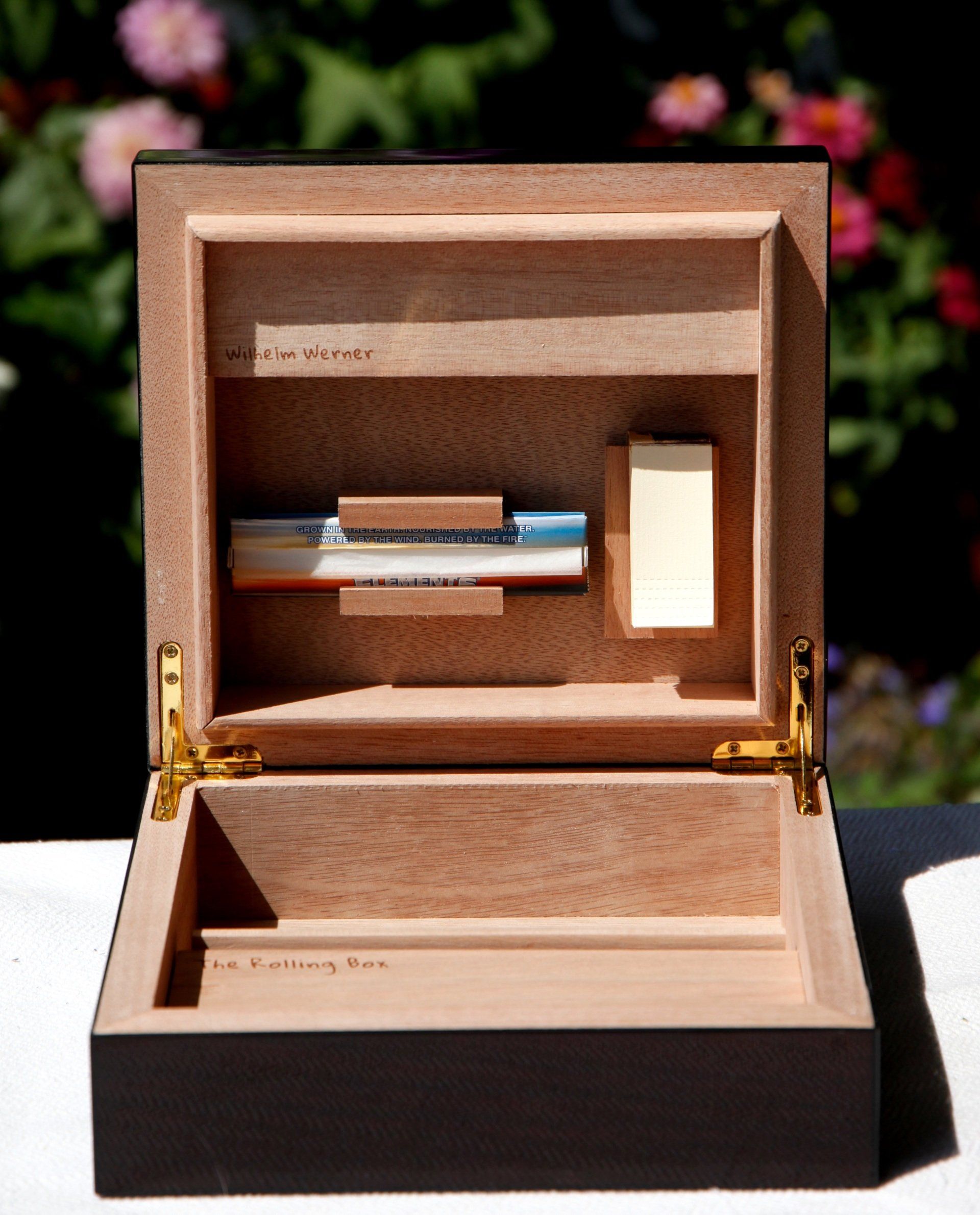 At the touch of a button, 3 warm white LEDs provide a pleasant and optimal illumination of the removable work surface, under which there is a small secret compartment and a drawer for catching the tobacco remains.